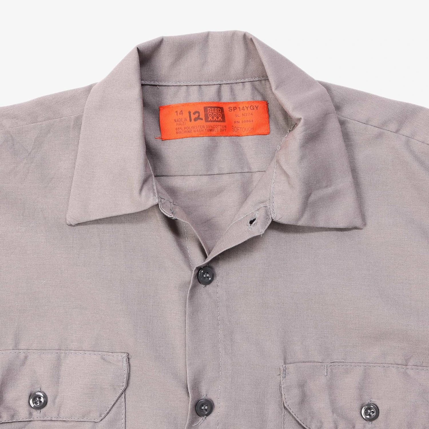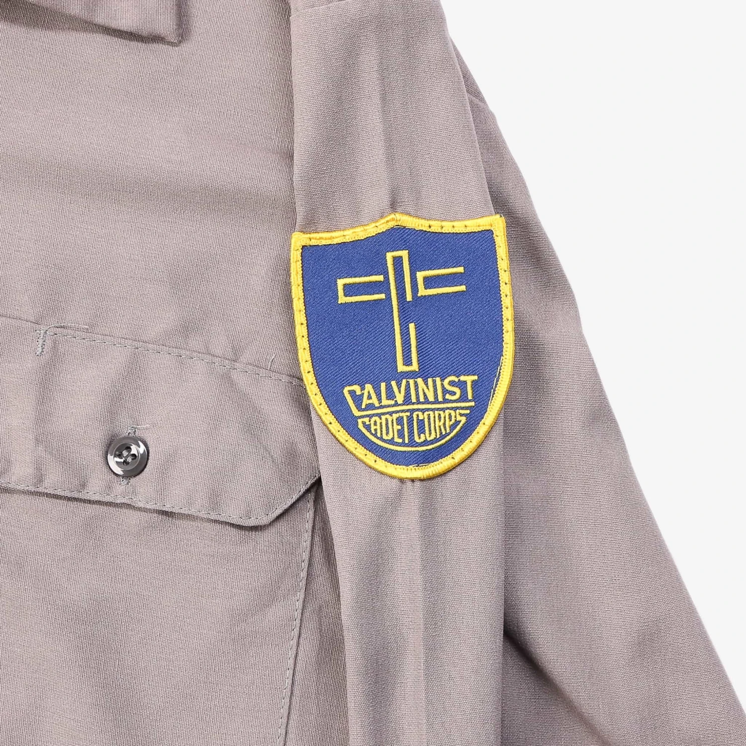 Vintage long-sleeved work shirt with authentic name and business logo patch.Â