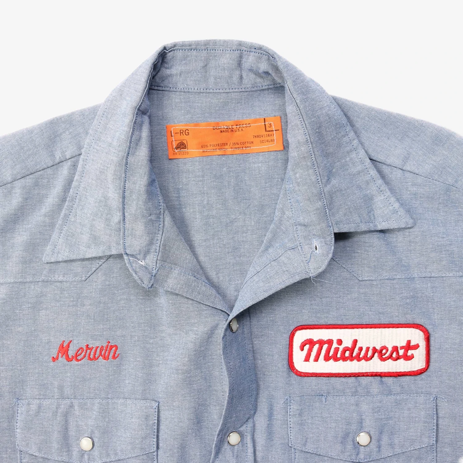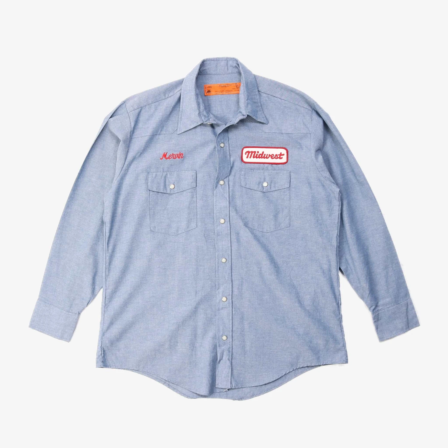 Vintage long-sleeved work shirt with authentic name and business logo patch.Â